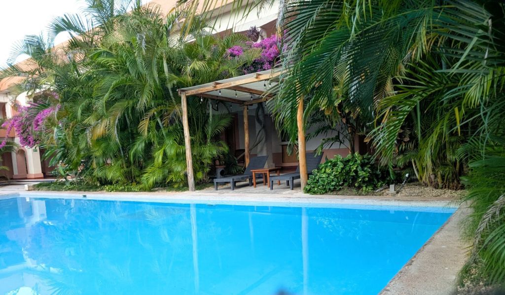 He dropped me off 10 minutes later at a side gate and said you’re here (in Spanish). I thought, really? It seemed weird to me, but they know, so I got out and went in. It was so nice inside! Very open and light. I was there a couple hours early but they  checked me right in. My room was so cute and across from the pool! It had 2 beds (1 full, 1 twin), a desk, bathroom (again, no TP in the toilet) and a window to the garden. Fabreezio and I went to the pool for a bit. It was cold but refreshing and after a few minutes it was fine. He sat by the edge or lounged under the cabana while I swam.