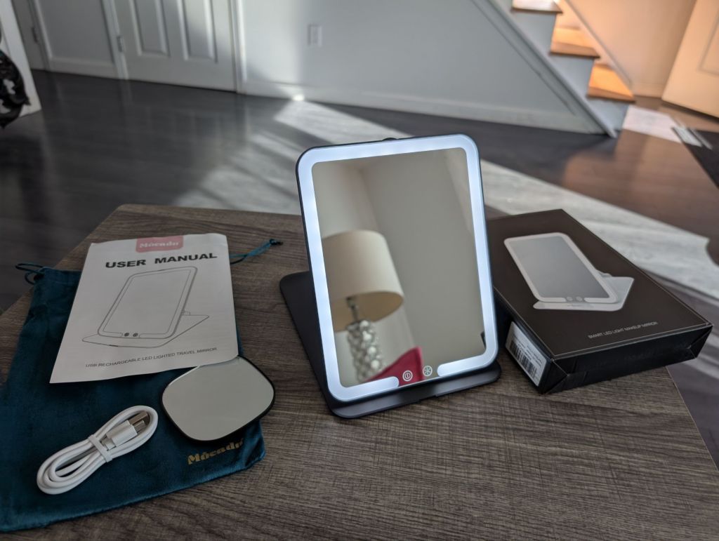 Mocado Travel Makeup Mirror with Light, Tripple Folding Vanity Mirror with Lights, 3 Colors Lighted Makeup Mirror, 1500mAh Rechargeable, Memory Function, Freely Adjust Height and Angle(Black) https://a.co/d/dO73nTs